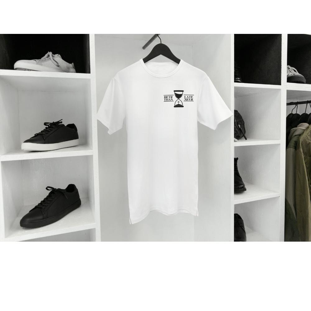 Step into timeless style with the BETR LATE THAN NEVR Classic Tee—displayed here in crisp white with the iconic hourglass and cross emblem on the chest. Minimal yet meaningful, this photo captures the shirt’s premium quality and bold message in a sleek, curated setting.